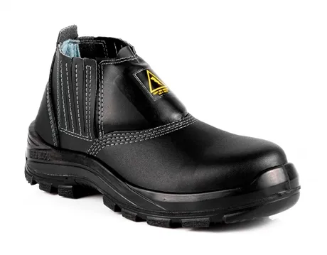 Calçado de segurança isolante elétrico de uso profissional tipo botina, fechamento em elástico, confeccionado em microfibra, forro interno em tecido, palmilha de montagem em material sintético montada pelo sistema strobel, palmilha interna removível, biqueira de composite, solado de poliuretano bidensidade injetado diretamente no cabedal, resistente ao escorregamento, sistema de absorção de energia na região do salto e resistente à passagem de corrente elétrica.
